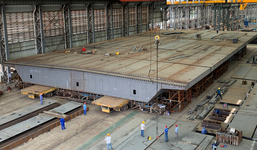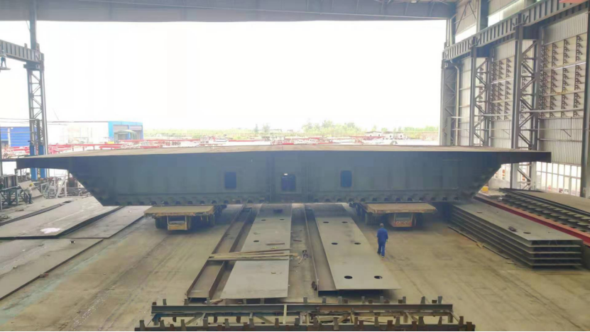 上午11時,隨著現場總指揮一聲令下,重達240余噸的首個鋼箱梁節段由兩臺150噸自行式液壓平板車緩緩抬起,平穩脫離總拼胎架并駛出廠房,標志著首輪6個節段拼裝完成并正式下胎,轉入室外臨時存放區。