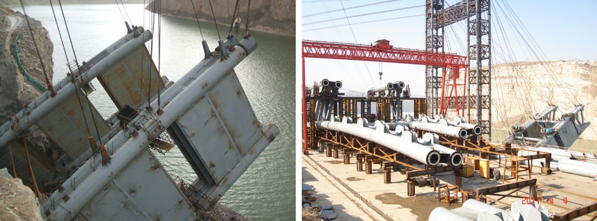 山西準朔黃河特大橋為上承式鋼管拱橋,主跨為360m的鋼管混凝土拱結構,工程量為9100噸。于2009月9月份開始施工,到2011年7月份完工。全橋采用橋為整體節段拼裝、纜索吊吊裝的施工方案,克服了四管拱腳空間定位、整體節段懸拼精確定位、冬季施工等難點。