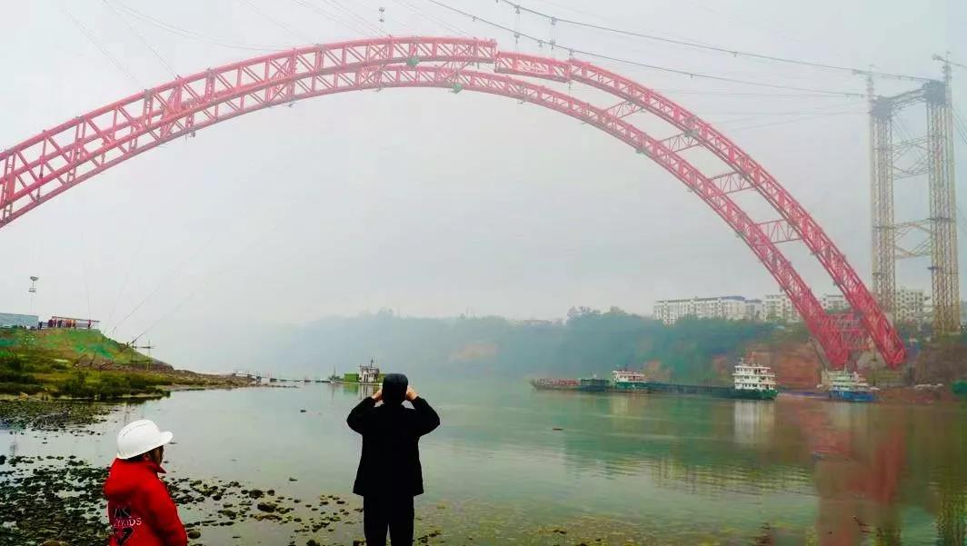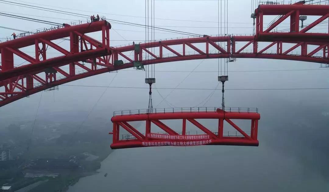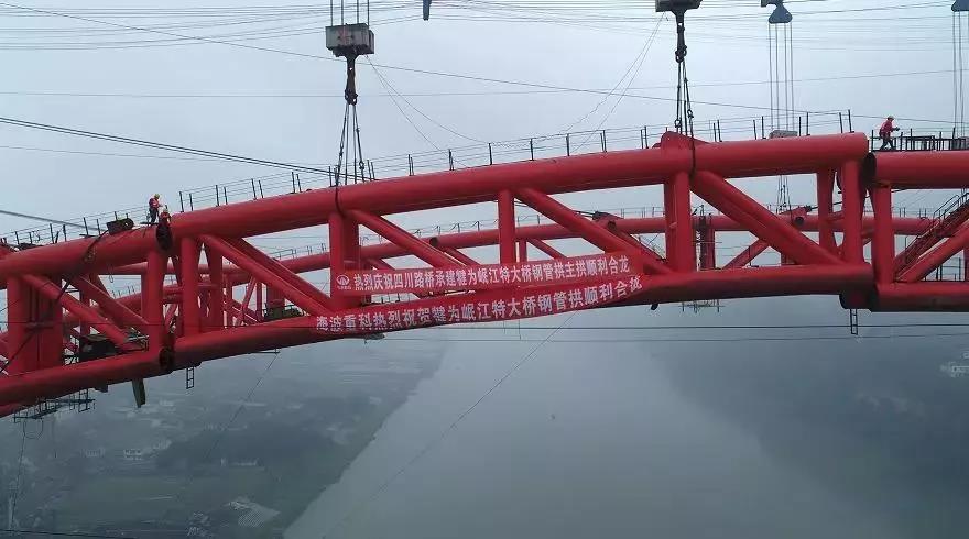 (海波重科新聞報道)2020年1月15日,犍為岷江特大橋施工現場,只見高高的吊塔聳立岷江兩岸,纜索吊裝系統已準備就緒;江面上,運輸船舶搭載著最后一段拱肋,將其運送到指定位置。“開始吊裝!”伴隨著現場一聲指令,拱肋從江面緩緩升起。經過1個多小時的吊裝,上午10時42分,由海波重科承接的犍為岷江特大橋主橋457.6m鋼管拱橋,完成最后一段拱肋吊裝,實現了拱圈高精度合龍,合龍精度3mm,合攏應力和全橋線形均滿足設計規范要求。