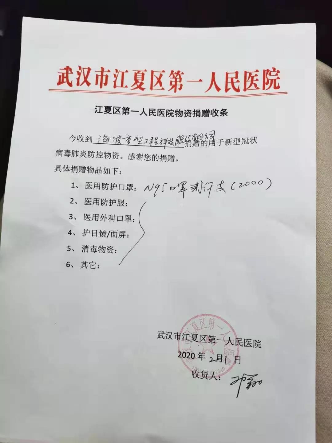 (海波重科新聞報道)一方有難,八方支援。為支援新型冠狀病毒肺炎疫情防控工作,2020年02月01日,海波重型工程科技股份有限公司向武漢市江夏區、武漢市經濟技術開發區(漢南區)相關部門共計捐贈現金及物資210000元,其中N95口罩2000只,定向捐贈給武漢市江夏區第一人民醫院,為抗擊新型冠狀病毒肺炎疫情貢獻綿薄之力。